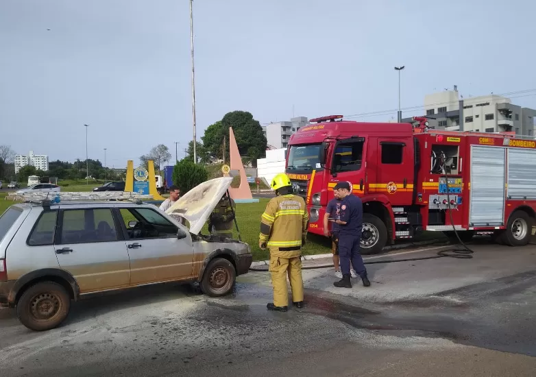 Fogo atingiu motor de Fiat Uno no trevo de acesso à cidade; proprietário usou extintor, mas bombeiros foram acionados para concluir o resfriamento