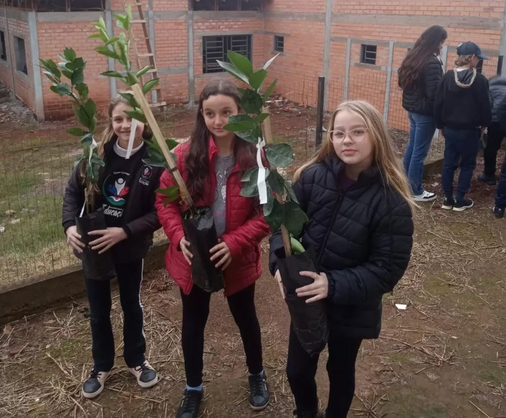 Alunos do 5º e 8º ano da Escola Municipal São José participaram do plantio de mudas frutíferas em ação promovida pelas Secretarias de Meio Ambiente e Educação.