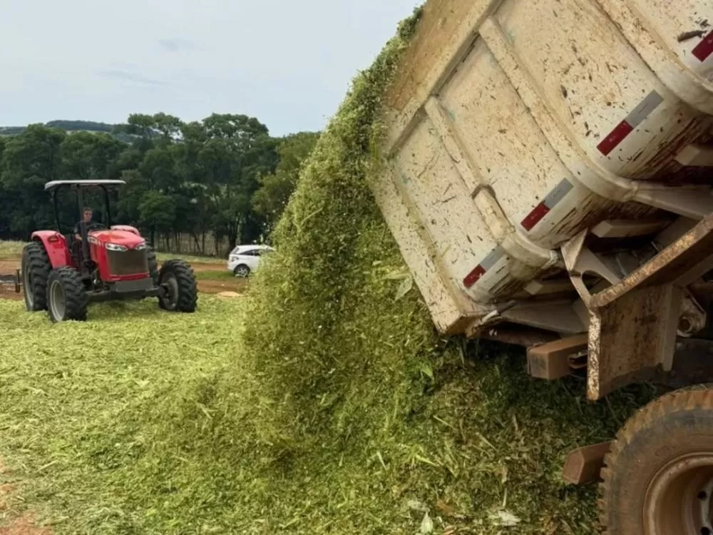 Atendendo à demanda por silagem, o serviço está sendo realizado com o apoio de tratores, ensiladeiras e caminhões, garantindo mais eficiência e qualidade na produção.