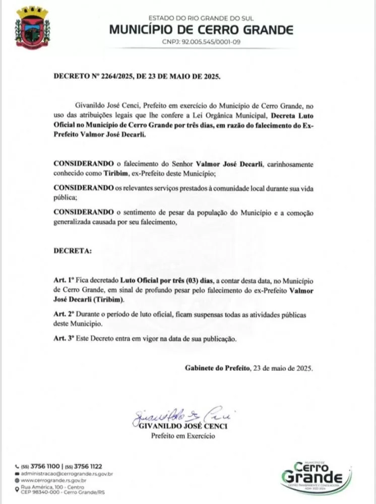 A Prefeitura de Cerro Grande decretou luto oficial de três dias em respeito à memória do ex-prefeito. Durante esse período, todas as atividades públicas estão suspensas. A administração municipal também disponibilizou veículos para transportar moradores que desejarem acompanhar o sepultamento em Trindade do Sul, com saída programada para as 13h.