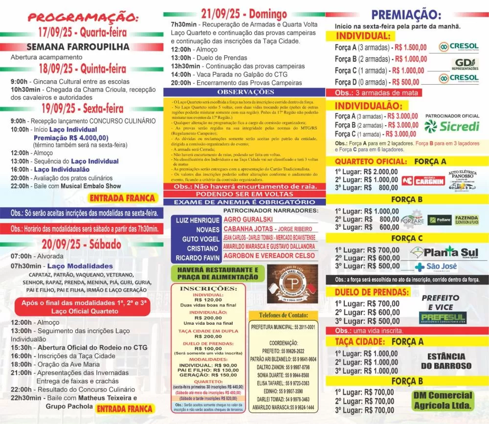 O rodeio será classificatório para o FECARS e distribuirá mais de R$ 30 mil em prêmios, atraindo competidores de toda a região sul. A entrada é gratuita durante todos os dias do evento.