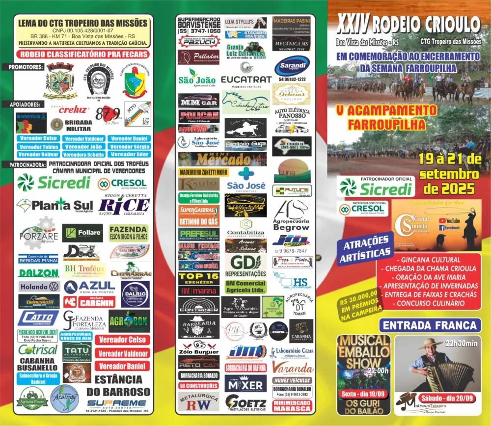 Entre os dias 19 e 21 de setembro, o município de Boa Vista das Missões será palco do XXIV Rodeio Crioulo do CTG Tropeiro das Missões, evento que marca o encerramento oficial da Semana Farroupilha. A programação reúne atividades campeiras, culturais e artísticas, reforçando a preservação da tradição gaúcha.