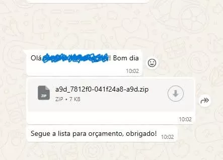 A armadilha é bem disfarçada. A vítima recebe uma mensagem que simula uma comunicação legítima, geralmente relacionada a "orçamentos" ou faturas. A mensagem incentiva o usuário a baixar e abrir um arquivo anexo para ver os detalhes.