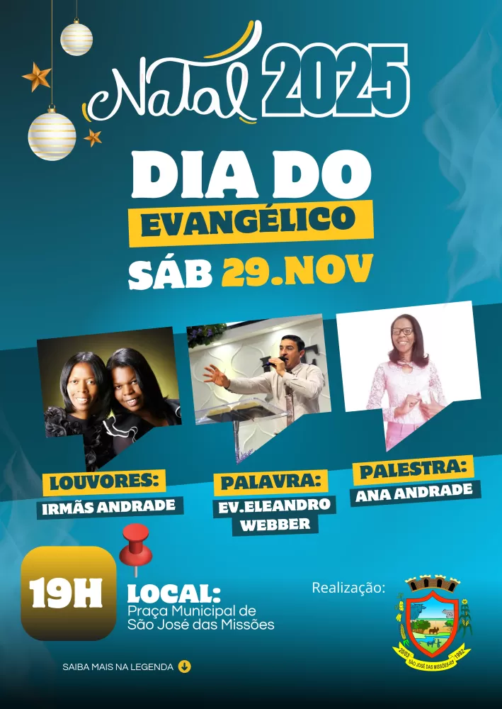 A comunidade de São José das Missões se prepara para celebrar o Dia do Evangélico no sábado, 29 de novembro, com uma noite dedicada à fé, ao louvor e à união. Organizado pela Administração Municipal, por meio da Secretaria de Assistência Social / CRAS, o evento foi preparado com carinho e promete reunir famílias para um momento de gratidão a Deus.
