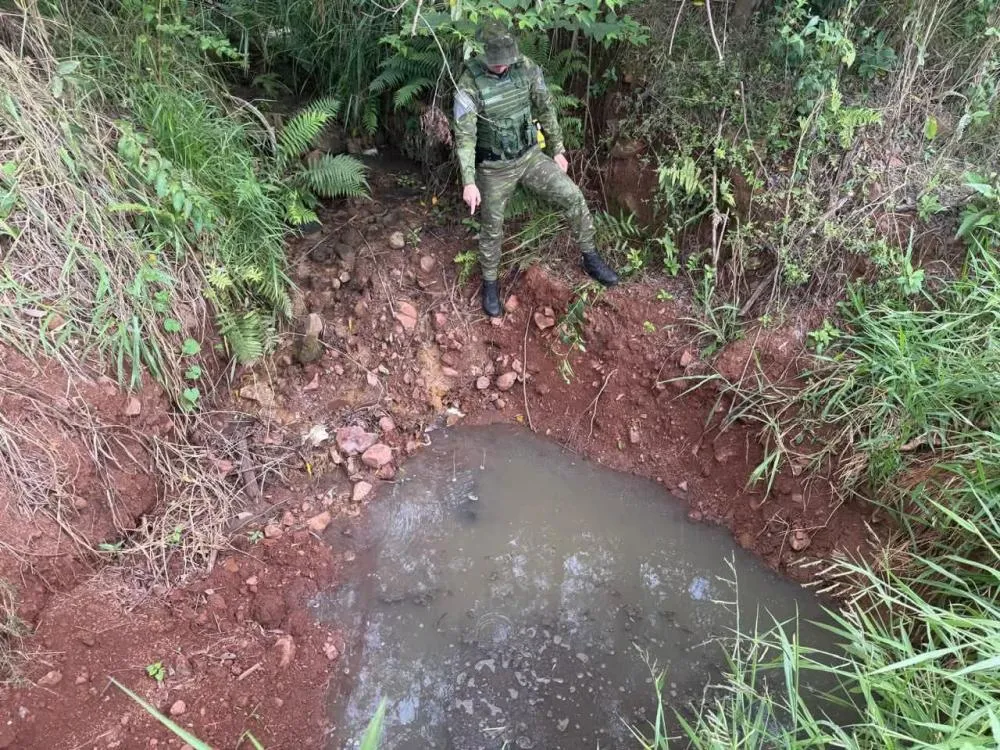 Ao seguir o curso do escoamento, a equipe do 3º BPAmb verificou que a origem da contaminação estava em uma propriedade rural com criação de suínos. No local, foi constatado que resíduos líquidos estavam sendo descartados de forma inadequada, atingindo diretamente o curso d’água.