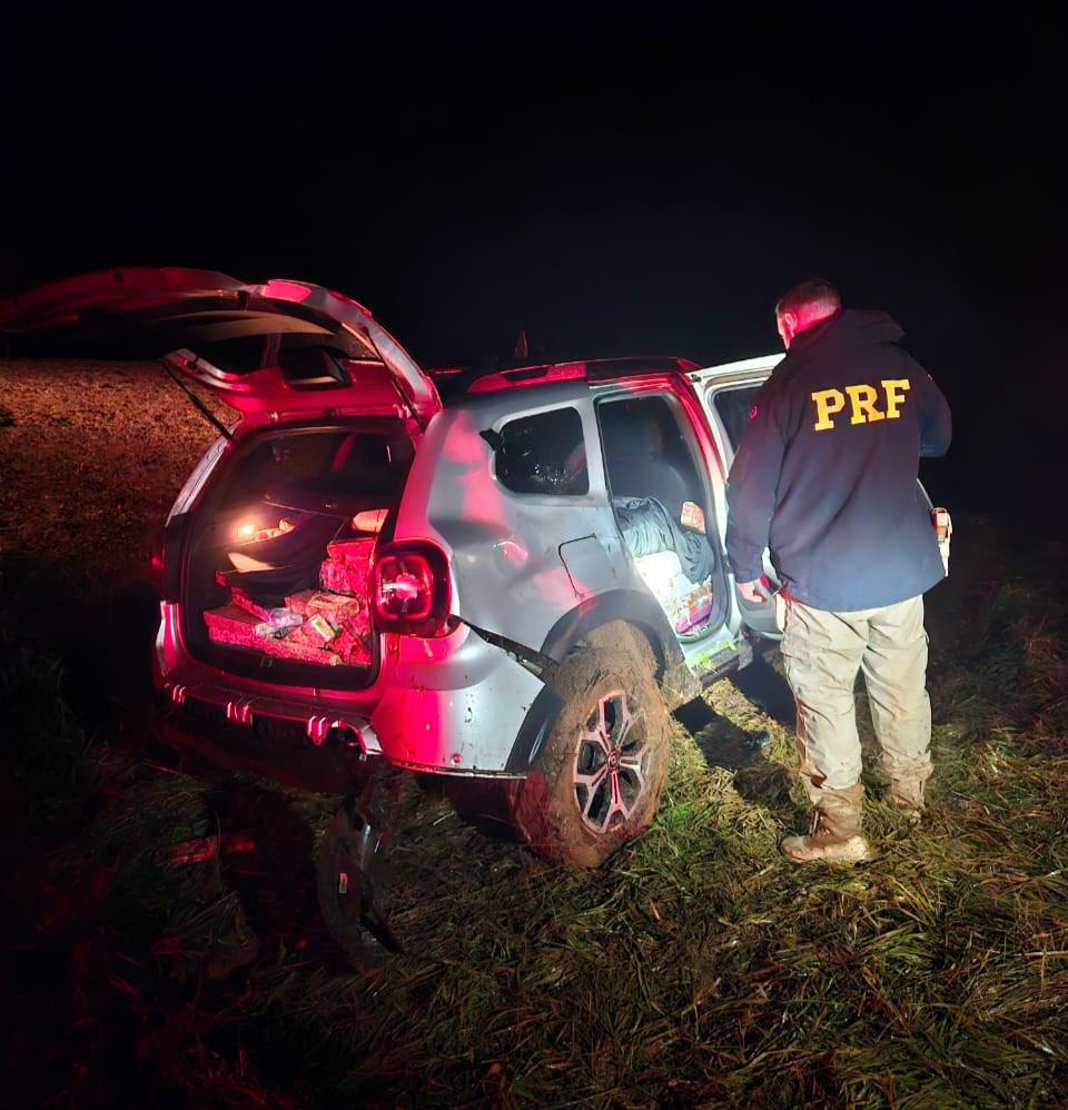 A viatura perseguiu o carro em fuga até que ele entrou em uma propriedade às margens da rodovia, abandonou o veículo e fugiu ao mato