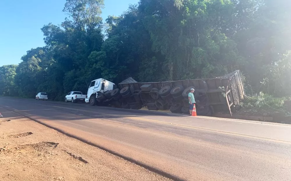 Caminhão carregado de milho tomba e causa lentidão na BR-386, em Seberi