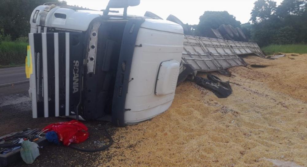 Carreta carregada com milho tomba na BR-386, em São José das Missões