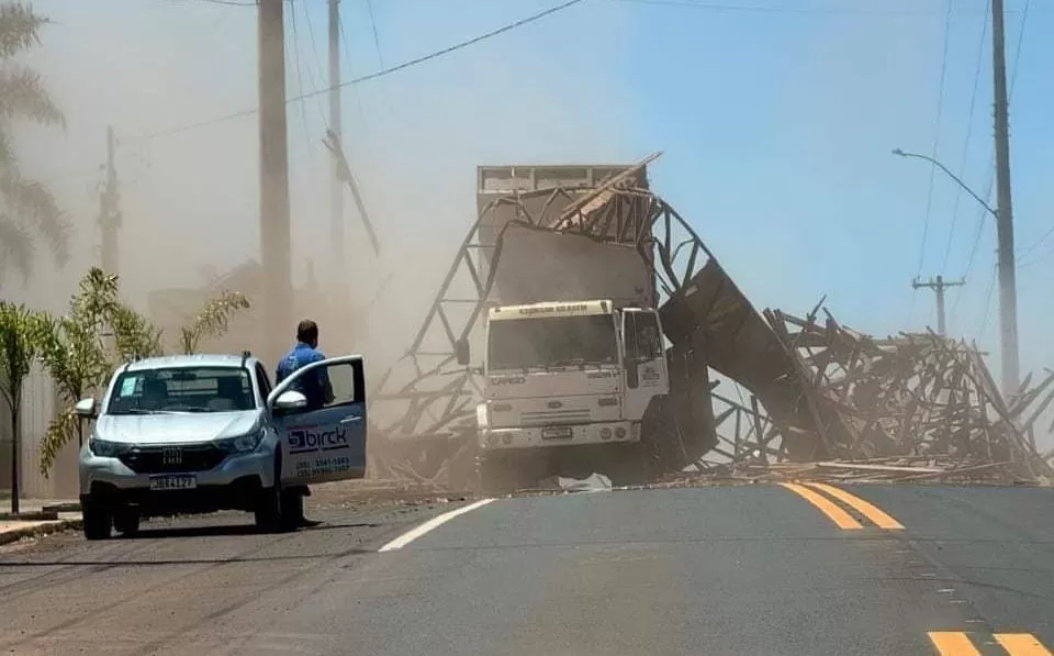 O veículo transitava em direção ao centro da cidade quando, por motivos ainda desconhecidos, a parte traseira da caçamba se elevou, atingindo a estrutura metálica do pórtico com grande força